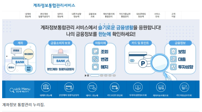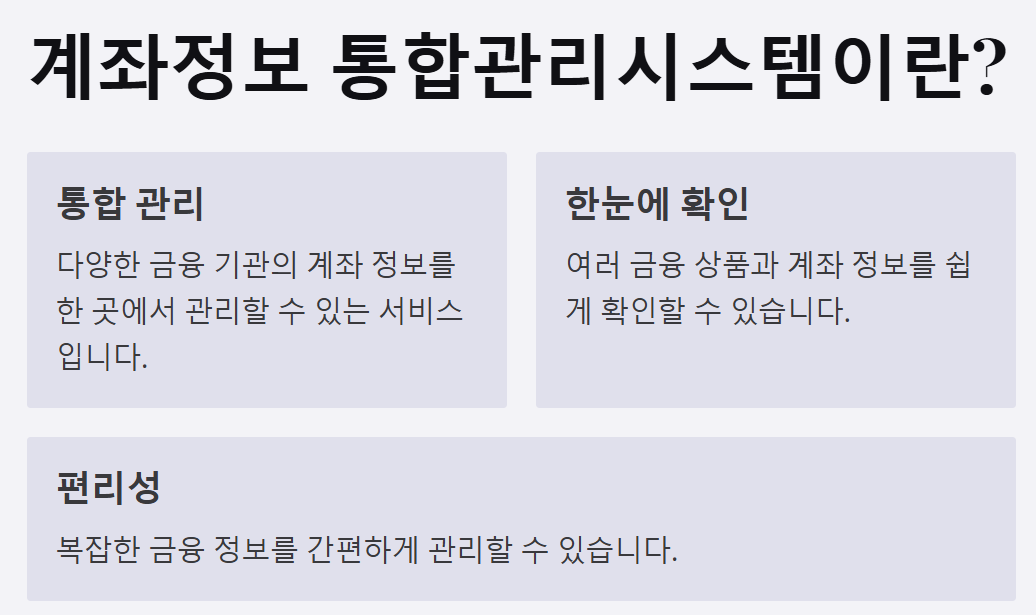 계좌정보 통합관리시스템은 다양한 금융 기관의 계좌 정보를 통합하여 관리할 수 있는 서비스입니다. 이를 통해 사용자는 여러 금융 상품과 계좌를 한눈에 확인하고, 필요한 정보를 손쉽게 조회할 수 있습니다. 특히, 금융결제원에서 제공하는 '어카운트인포' 서비스가 이 시스템의 대표적인 예입니다.