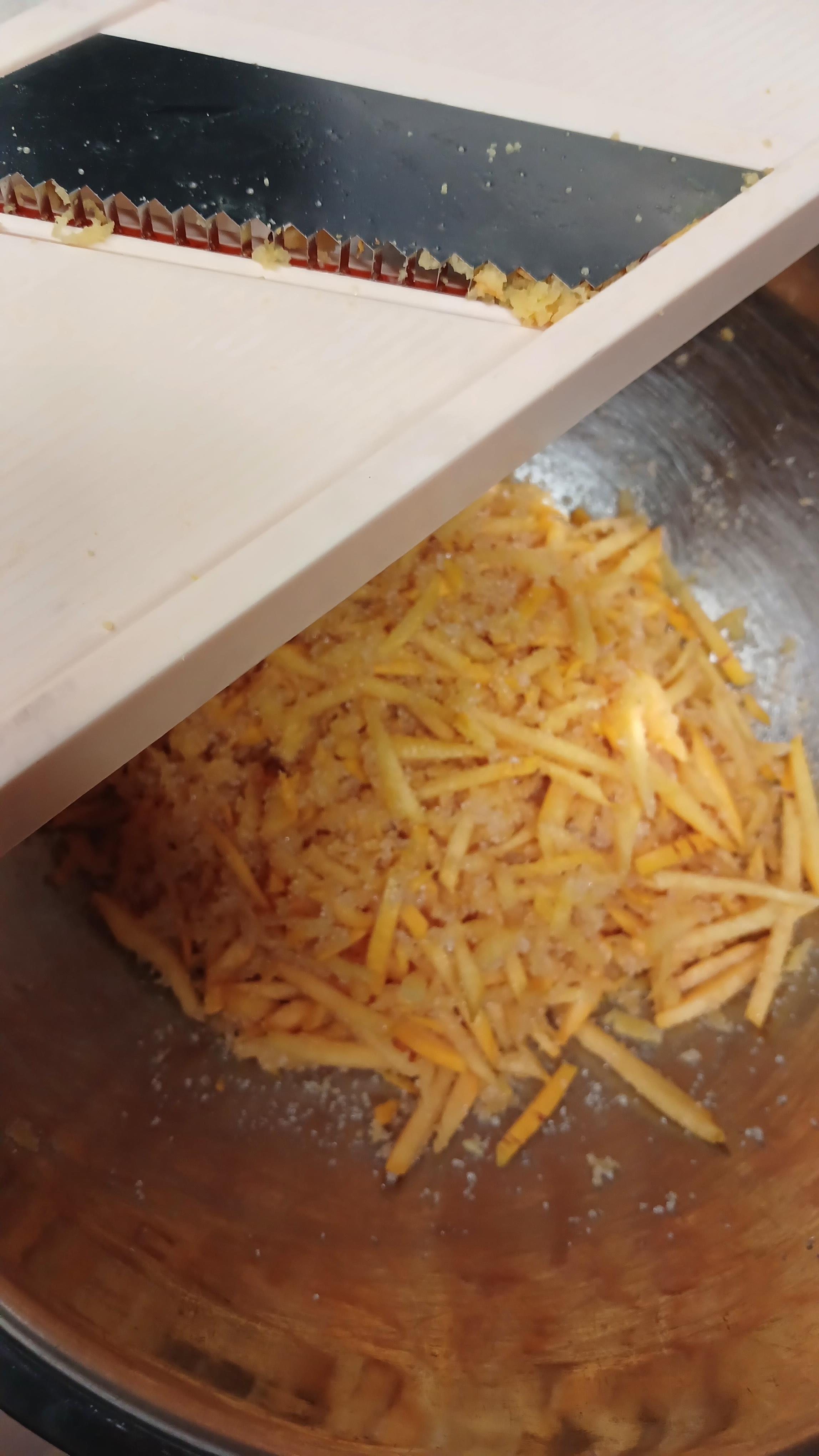2~3mm 두께로 얇게 썰면 모과청 숙성이 빠르고 식감도 부드러워집니다. 채칼을 사용해서 채를 써는 방법도 괜찮습니다.