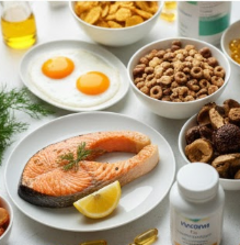 - 음식 섭취: 연어, 고등어 같은 등푸른 생선과 계란 노른자, 표고버섯 등을 식단에 추가하세요. 다만, 음식만으로는 비타민D 부족을 완전히 해결하기 어려우므로 보조적인 수단으로 활용합니다.