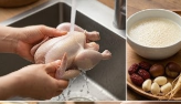 - 속 채우기: 불린 찹쌀 3큰술, 대추 2알, 밤 1알, 인삼 1뿌리, 마늘 3알을 닭 속에 채웁니다.